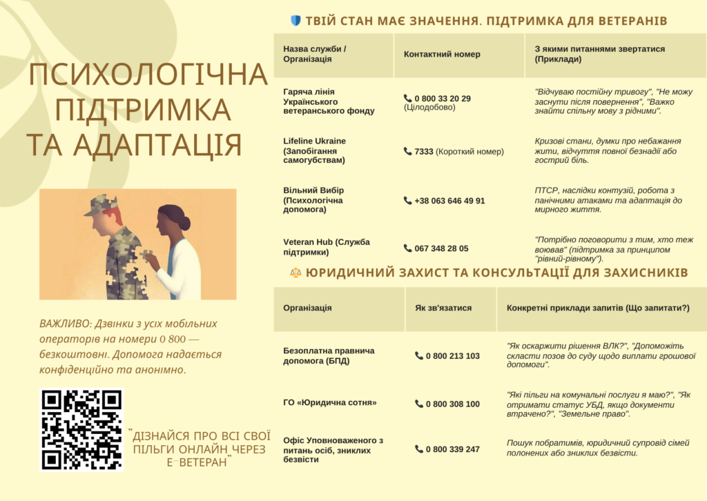 Ми прагнемо, щоб кожен ветеран нашого підприємства відчував себе захищеним та впевненим у завтрашньому дні. Саме тому нагадуємо про важливі ресурси підтримки, які доступні для вас та ваших родин.